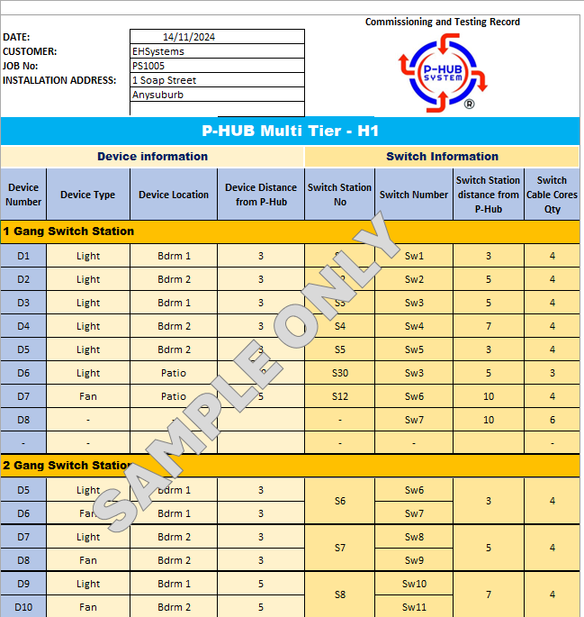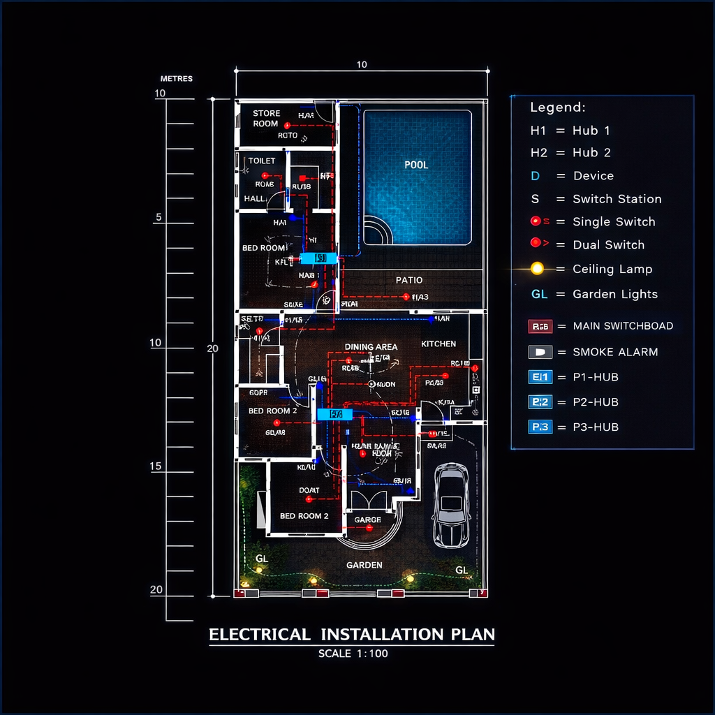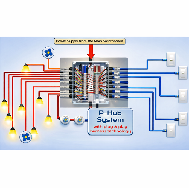 Pre-engineered hub + Harnesses for Lighting, switches, fans & smoke Alarm.